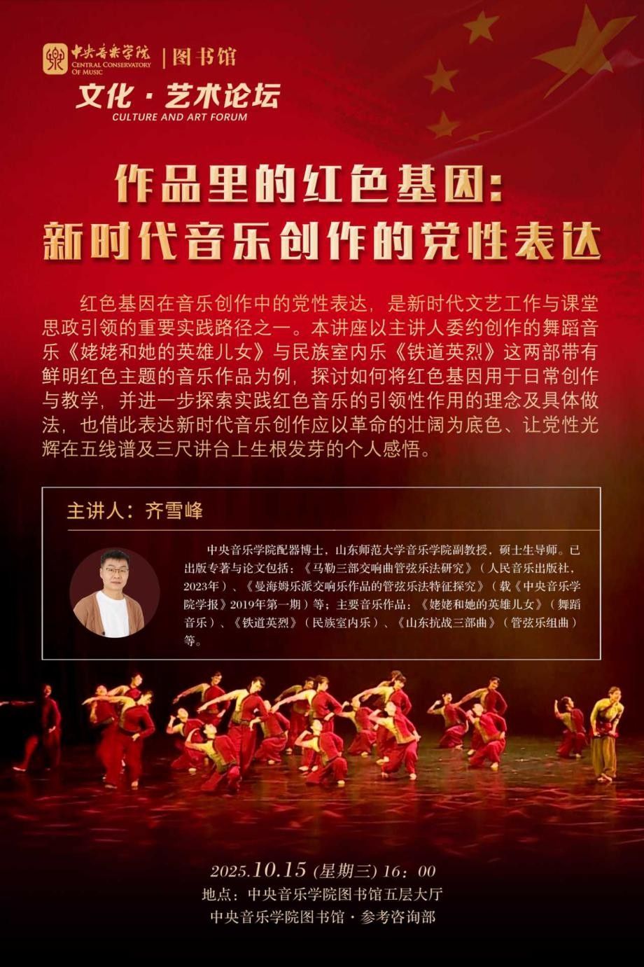 为深入贯彻弘扬习近平总书记十·一五讲话精神,探究红色基因在音乐创作中的党性表达,我院作曲系校友、山东师范大学音乐学院齐雪峰老师,将于2025年10月15日(周三)应邀做客图书馆“文化·艺术论坛”。齐老师将为广大师生读者分享新时代音乐创作如何以革命壮阔历程为底色,让党性光辉在音乐创作与教学中绽放光芒的深刻感悟。本场讲座以齐雪峰老师委约创作的舞蹈音乐《姥姥和她的英雄儿女》和民族室内乐《铁道英烈》这两部具有鲜...